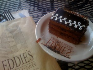 And when you eat lunch at Eddie’s, make sure to leave room for dessert. On this day, Tracy and I split a piece of chocolate cake. I asked the baker what the name of this cake was and he said it didn’t have one. But then he made up the name “sprinkly shoelace chocolate cake” just for us.