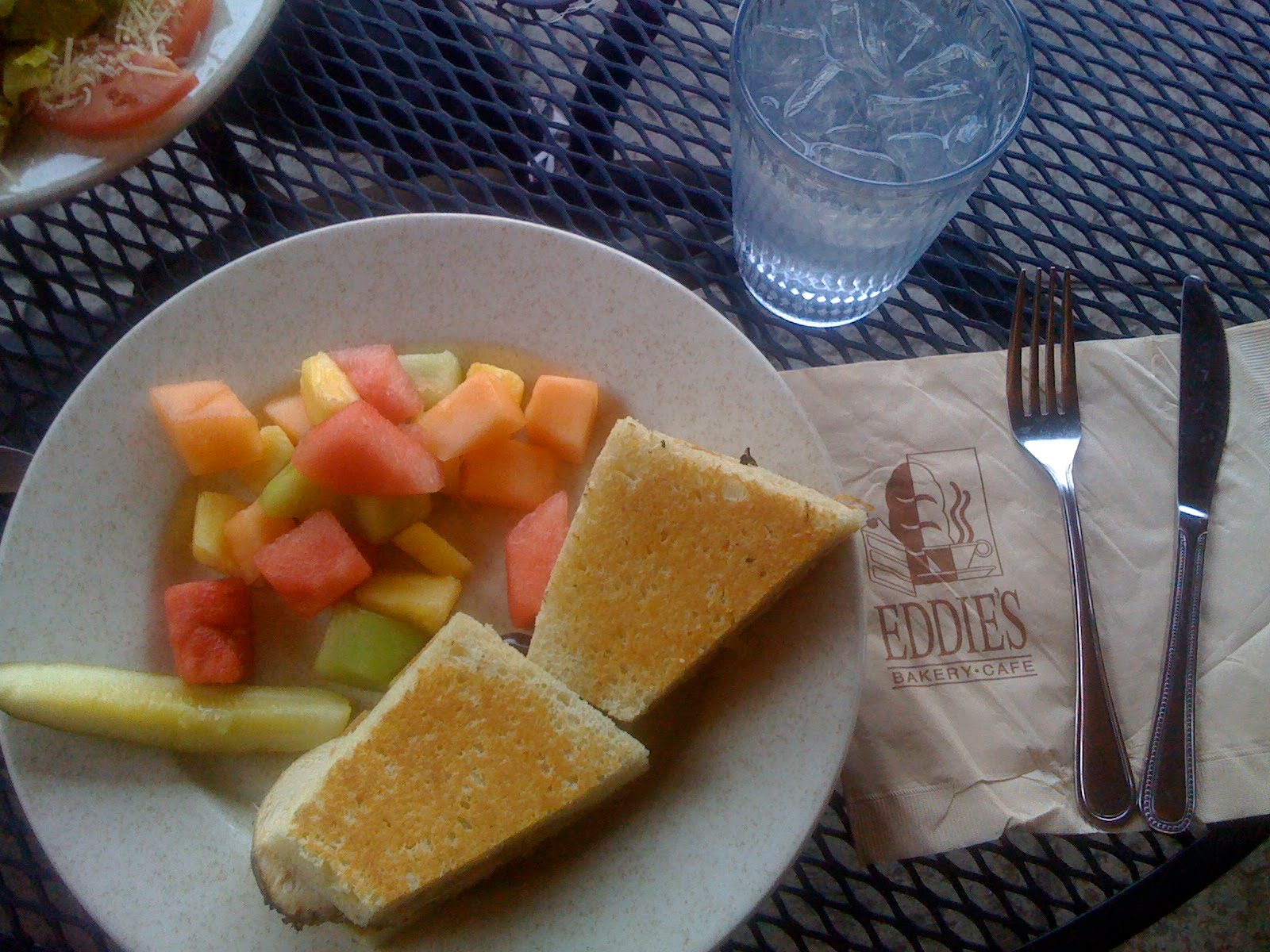 One of my longtime favorite Fresno lunch spots has to be Eddie’s Bakery Cafe on the northwest corner of Cedar and Herndon. My good friend Kelly Paramo first took me there circa 1995 when we were Fresno State undergrads and I’ve been loyal ever since. I like to go to Eddie’s with my wife Tracy (pictured above) to watch happy people walk out of the place while delicately carrying giant decorative cakes and fruit tarts in their arms.
