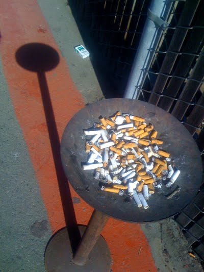 Cigarette butts pile up in a makeshift ashtray next to the technology building at Fresno City College. According to the campus smoking and drug abuse policy, “In order to provide a healthier climate for teaching, learning and study, smoking is prohibited in all campus buildings. Additionally, tobacco products are not sold on campus.” No more than four feet away, a sign on the fence reads, “No smoking in this area.” Shot 23 June 2010.