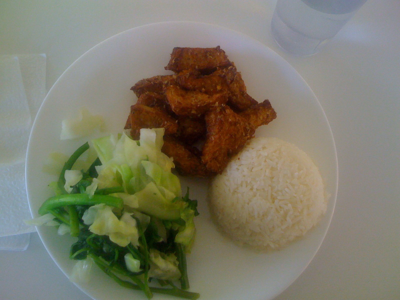I ordered the No.6, a dish called Blissful State. It consisted of lemongrass vegan soy protein, steamed rice, and veggies. This is my favorite dish from Loving Hut, and has stayed mostly the same since the restaurant was formerly called Au Lac, before the national affiliation sometime in the last year. The pepper flakes make the lemongrass vegan soy protein so hot, and it’s one of my favorite fake meat dishes in town.