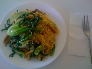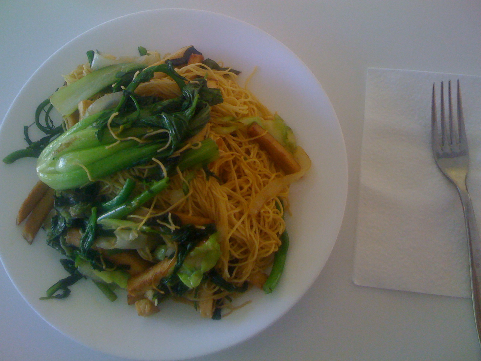 Tracy ordered the No.11, a dish called Meditative Chow Mein. It had delicate yellow noodles, tofu, vegan soy protein, onions, and veggies. Later, in her experiments with her Take-out Menu Cookbook, Tracy has tried to re-create this dish at home, to excellent effect. So excellent, in fact, that I’m actually eating bok choy willingly these days. (I’m a picky veggie eater and always have been, but this dish has changed my mind about bok choy.)