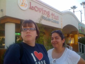 Marisa and her family eat mostly vegetarian and vegan food, so we delighted in taking her to one of our favorite Fresno vegan restaurants, Loving Hut, near Fresno City College in the Tower District. Loving Hut is a small national chain of vegan restaurants whose motto is: “Be veg. Go green. Save the planet.” Of course, I love saving the planet and being green as much as the next guy. But I also happen to love the vegan Vietnamese food at Loving Hut.