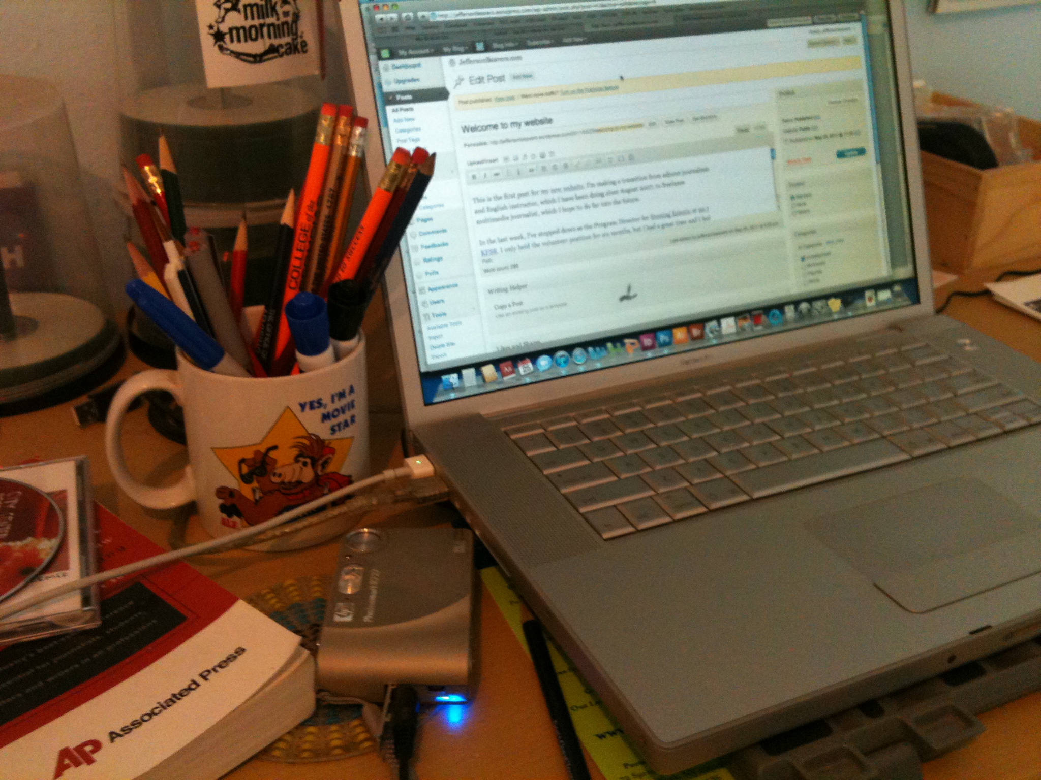 This is the first post for my new website. I’m making a transition from adjunct journalism and English instructor, which I have been doing since August 2007, to freelance multimedia journalist, which I hope to do far into the future. I’ve been spending a lot of time the last couple days setting up my website, working on business cards, making to-do lists, etc.