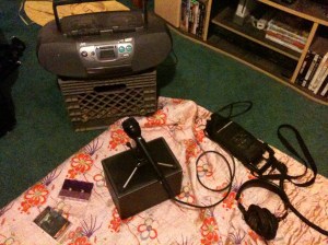 I also interviewed Fresno musician Luke Giffen for the story. His former band, The Sleepover Disaster, released its last album on CD via the now-defunct indie label Devil In The Woods. His current band, The Quiet Americans, released its debut EP, “Medicine,” on cassette via coattrack. I reviewed the EP back in May for Fresno Famous, and I had played tracks from it on my old Evening Eclectic show. But I listened on repeat to “Medicine” on cassette tape in my car during the final week I spent working on this story, and I have to say that I absolutely fell in love with it. The warble and the wobble really intensified as I studied the record on tape, as opposed to the digital versions of the songs I had first gotten to know. Listening to “Medicine” on tape, quite simply, made it better. And that surprised me. The experience of hearing and appreciating “Medicine” in a new way in my car gave me an idea. For the story, instead of using high-quality .WAV files for the music in the piece by The Quiet Americans, Achievement House, and the Fay Wrays, I went old-school instead. I first dusted off my old JVC boombox, which was buried under a pile of fabric in my wife’s craft room. I readied the cassette tape versions of the three albums I was using and carefully fast-forwarded to cue up the songs I wanted. I hooked up my Marantz 660 digital recorder and ElectroVoice RE-50/B omni microphone to capture the sound. And then I played the music out of the boombox, muddy distortion and all, right into the Marantz. The results, as you’ll hear, sounded great.Here’s the link to the final radio story. As a bonus, here’s a link to Giffen’s beautifully affecting homemade video for The Quiet Americans song “Be Alone.”
