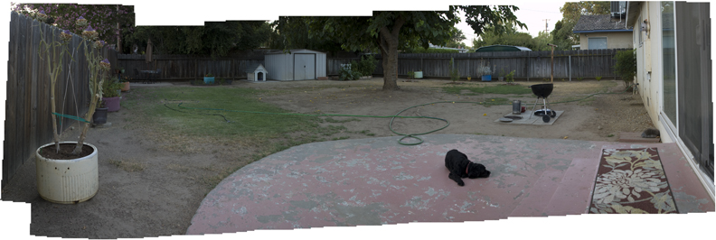 A panorama of our backyard, taken just after sunrise this morning, shows some of our garden projects in progress.